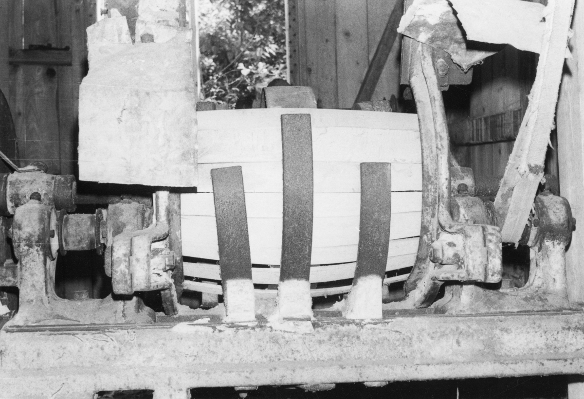 Interiör från Stegareds tunnbinderi. Sammanfogningsmaskin, där bilderna 3-6 visar detaljer. August Svensson, nämndeman och jordbrukare, startade en liten industri av dritteltillverkning i Stegared vid sågen i Mjällsjöbäcksfallet. Från 1913 fanns här även en turbin för elkraft. Efter August död på 1930-talet tog sonen Artur Svensson över och fortsatte rörelsen till 1965. Industrin sysselsatte 5-6 arbetare. Man tillverkade drittlar av bok för lagring av smör åt mejerierna fram till 1950-talet. Anläggningens intagskanal rinner i en ränna av huggen natursten, som vid turbinintaget övergår i en betongkonstruktion. På husgrunden efter drittelfabriken uppfördes ett bostadshus i timmer. (Se även bild VMF031965:a-b samt samt VMA12342_1-16).