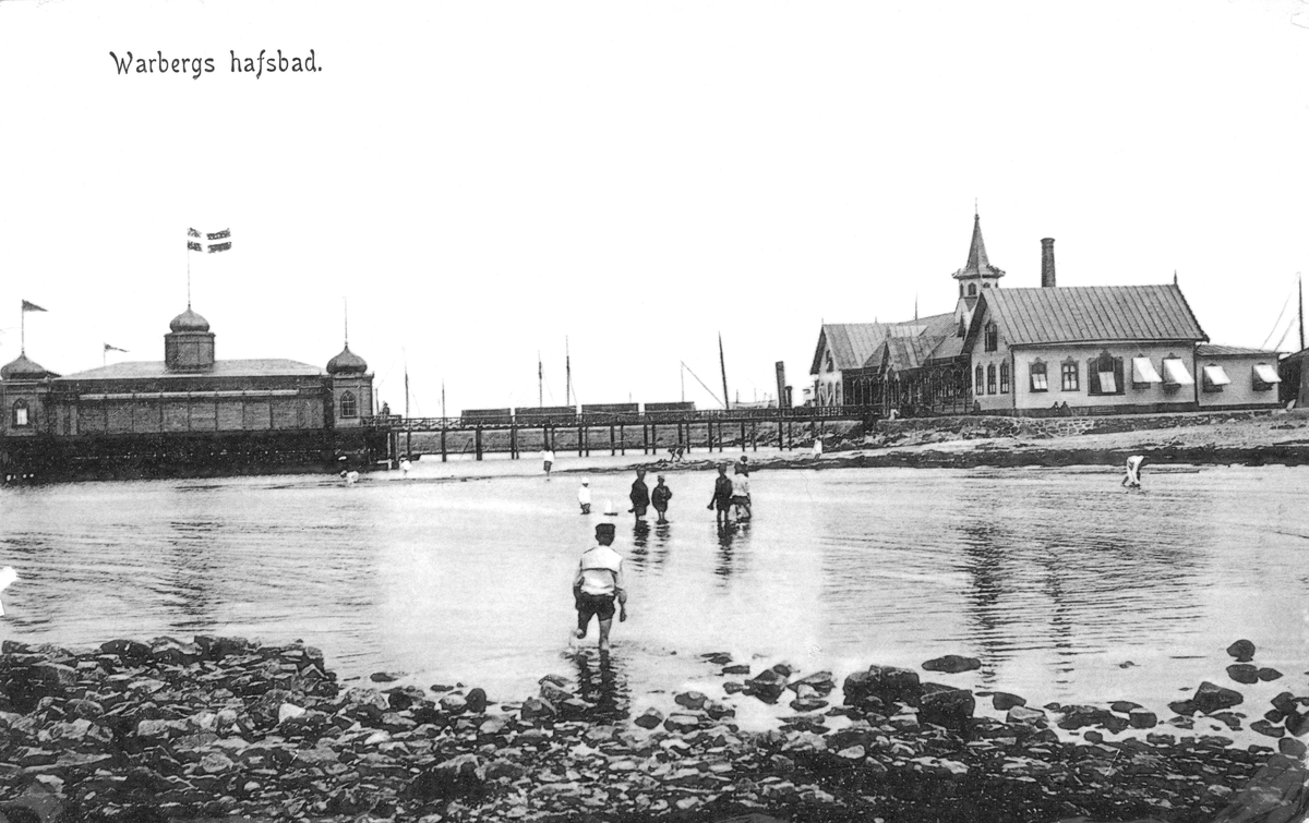Vykort, "Varbergs Hafsbad". Vy över viken vid Barnens badstrand, söder om badhusen; kallbadhuset till vänster och varmbadhuset till höger. Varmbadhuset har ännu inte fått sin tillbyggdad med veranda åt söder. Några påklädda barn vadar i vattnet.
