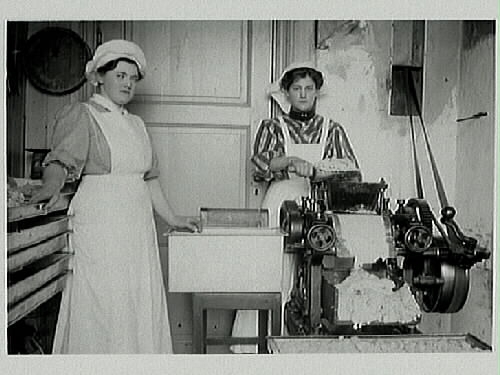 Två karamellkokerskor i arbete vid Knutsons marmeladfabrik. Fabriken låg på Drottninggatan 5, kv Flickskkolan 6 i Varberg.