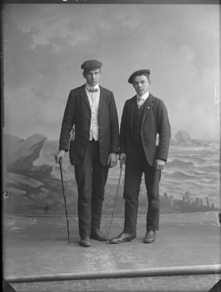 Ateljéfoto av två unga män där den ena är smedarbetare Oscar Andersson (beställare) i Ätrafors. De har båda kepsar, käppar och i kavajfickorna nedstuckna tidningar.