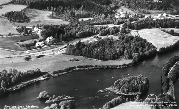 Vykort, "Flygfoto över Ätrafors" med ån Ätran. Enstaka enfamiljshus med trädgårdar i skogssprängt odlingslandskap. Järnväg.