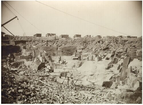 Stenhuggeri. Vy över stenbrottet Kullgrens Enka vid fästningen i Varberg. Nere i gropen står stenhuggare och längs ovankanten ses arbetsbodar. Tidigt 1900-tal, se även bildnr E5091.