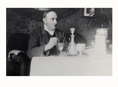 Wilhelm Ranch med en toddy i sitt hem på Wilhemsberg. Vid hans glas på bordet står en sockerskål och en glaskaraff. Ägare till Ranchs stenhuggeri.