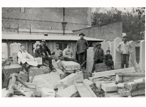 Stenhuggeri i hörnet Kyrkogatan-Kungsgatan i kv Köpmannen. Stenhuggare och ett par barn bland gravstenar i olika grad av färdigställande. Bilden tagen mot sydost. 1920-tal.