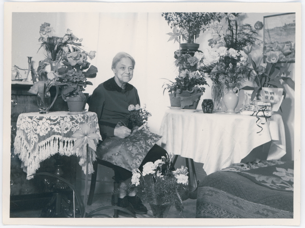 Porträtt på Gymnastikdirektör Wivi (Vivi) Wallgren 75 år, Jönköping. Dotter till Plåtslagare Hugo och Hanna Wallgren.