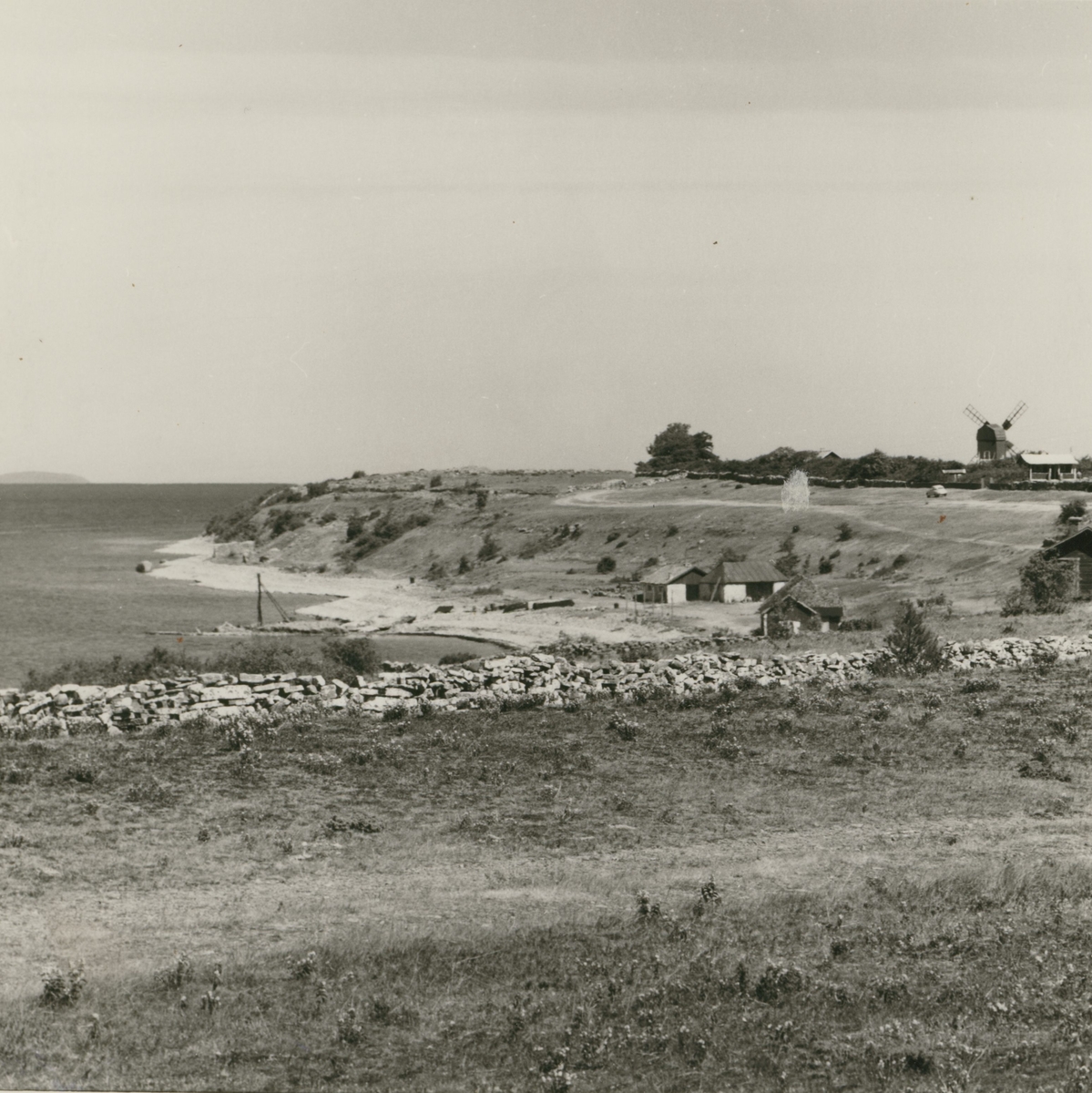 Byn och stranden mot norr. I bakgrunden Blå Jungfrun.