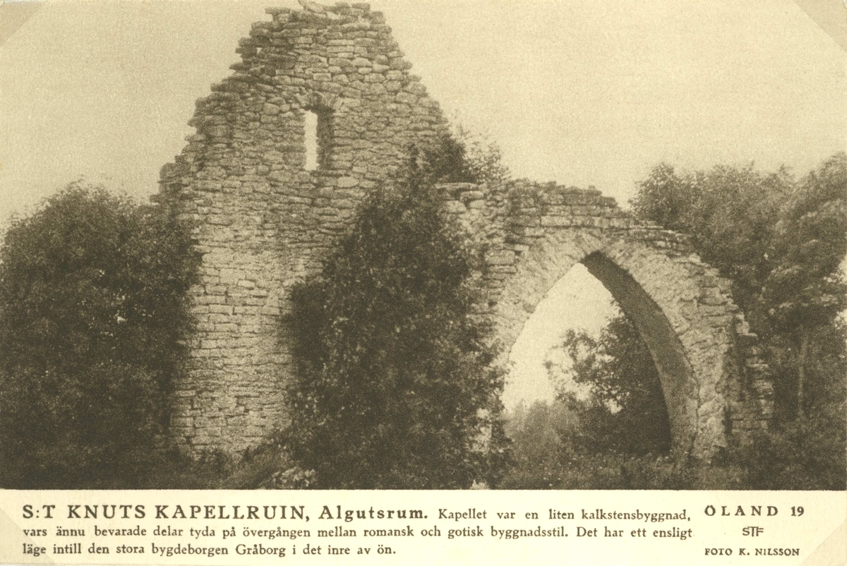 Text under bild; S:t Knuts kapellruin, Algutsrum. Kapellet var en liten kalkstensbyggnad, vars ännu bevarade delar tyder på övergången mellan romansk och gotisk byggnadsstil. Den har ett ensligt läge intill den stora bygdeborgen Gråborg i det inre av ön.