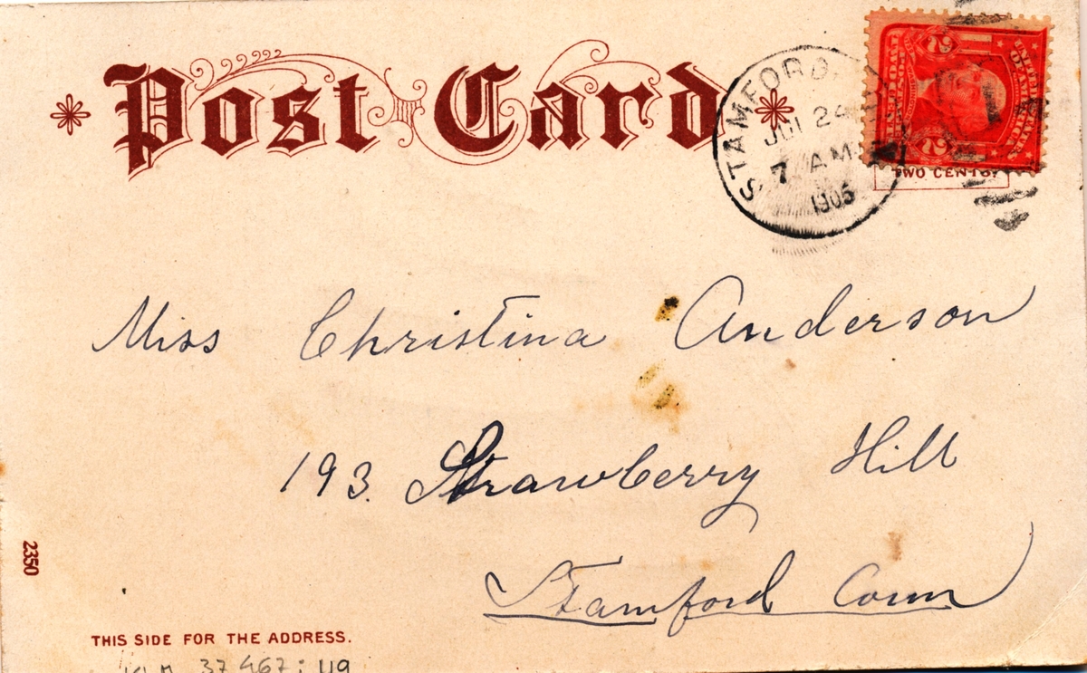 Ett vykort till Christina Andersson, 193, Strawberry Hill, Stamford, Connecticut från Lotten.