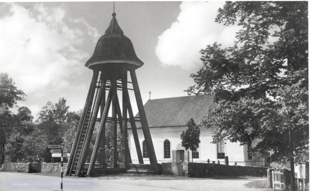 En klockstapel vid en kyrka i nyklassicistisk stil. Karlslunda socken.