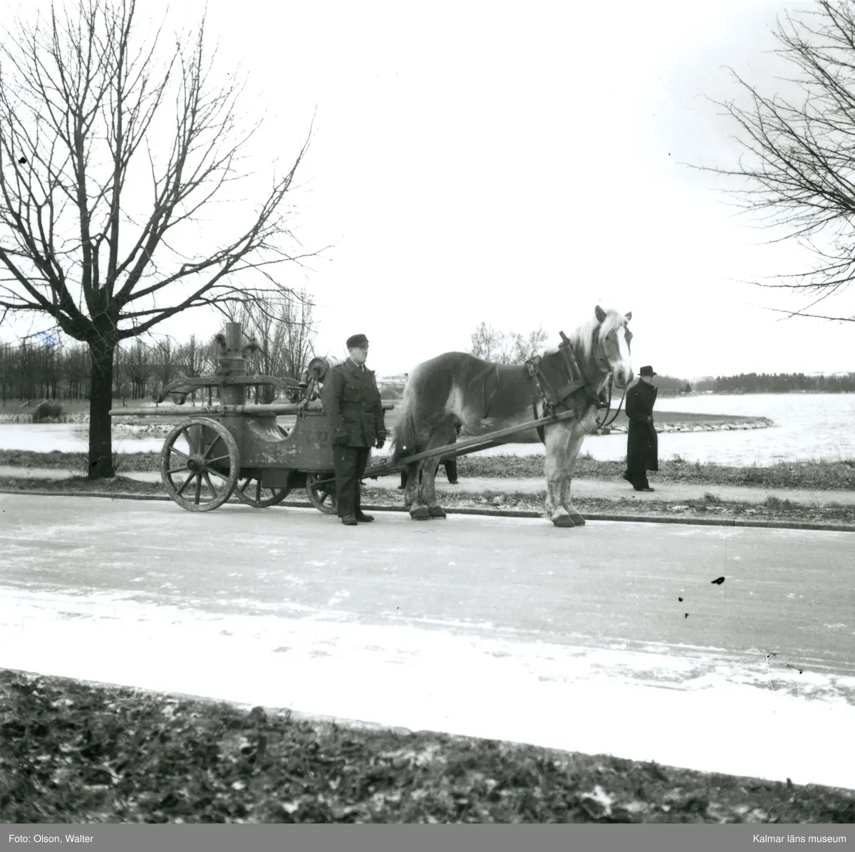 En gammal brandvagn paraderar under firandet av Kalmar brandkårs 40-årsjubileum den 1:a januari 1946.
