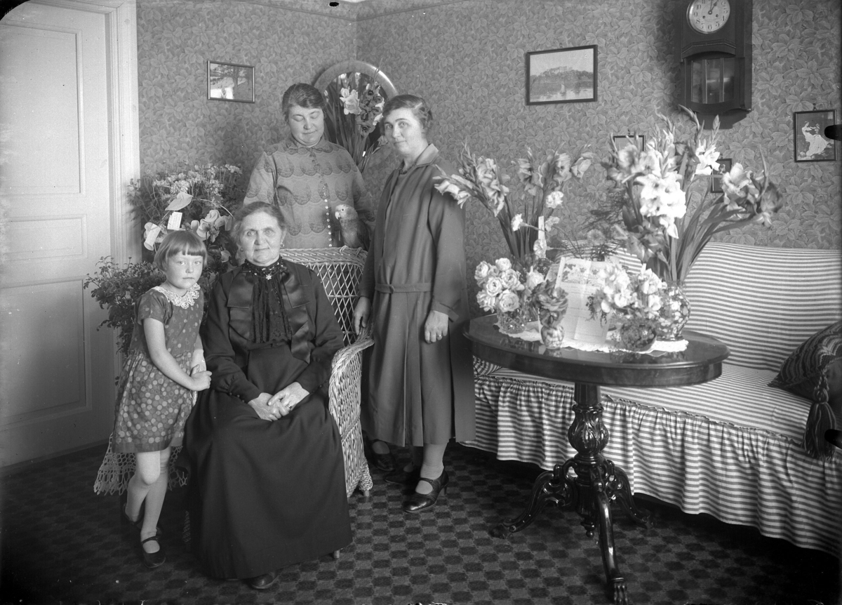 En kvinna från Kalmar uppvaktas på en högtidsdag. Enligt Walter Olsons journal är bilden beställd av fru H Landh. Kalmar läns museum känner inte till om den personen är avbildad.