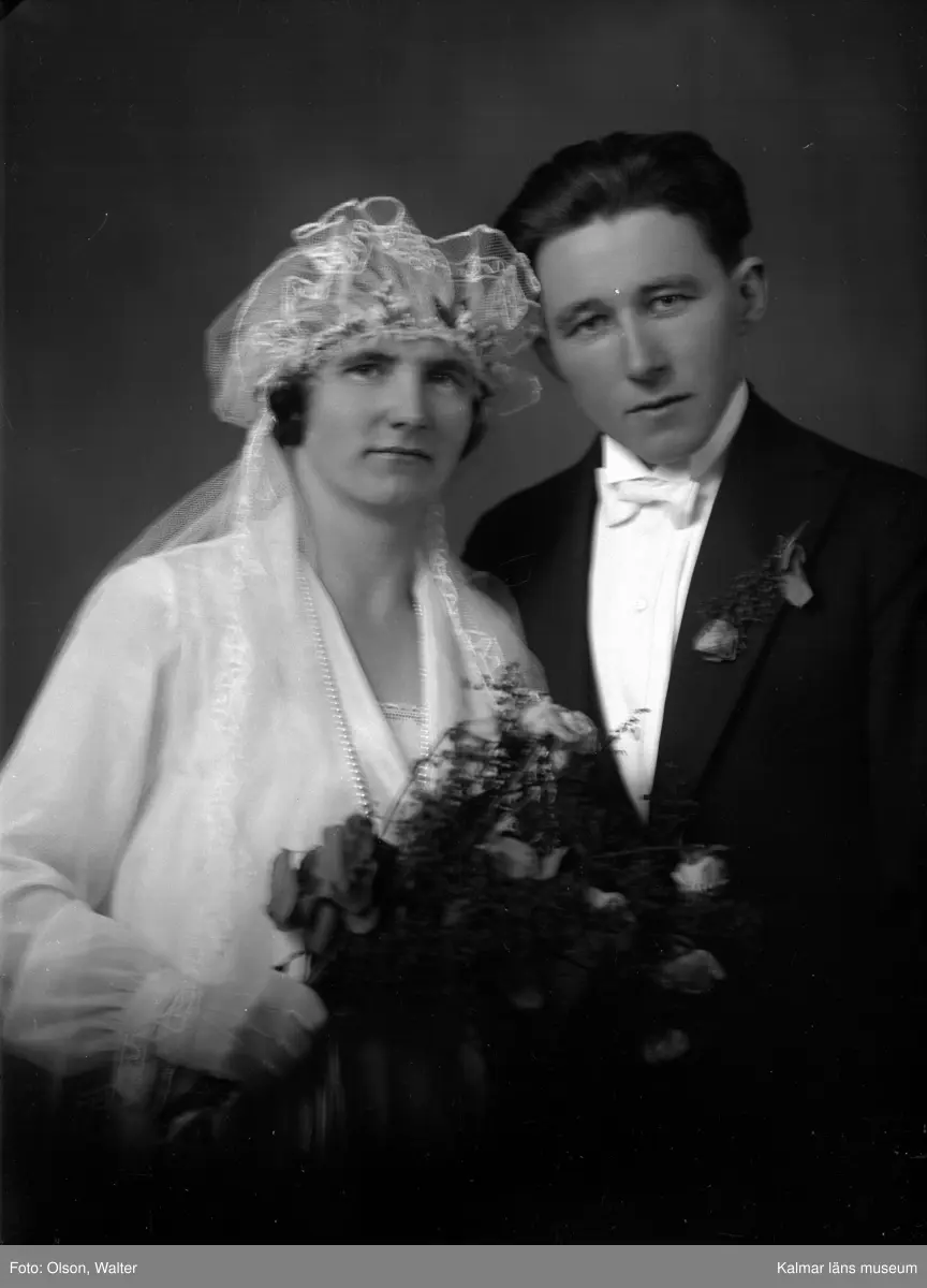 Bröllopsfoto av ett nygift par. Kvinnan har slöja och håller i en blombukett. Mannen har frack. Enligt Walter Olsons journal är bilden beställd av Evald Palmgren ifrån Södra vägen 21 i Kalmar.