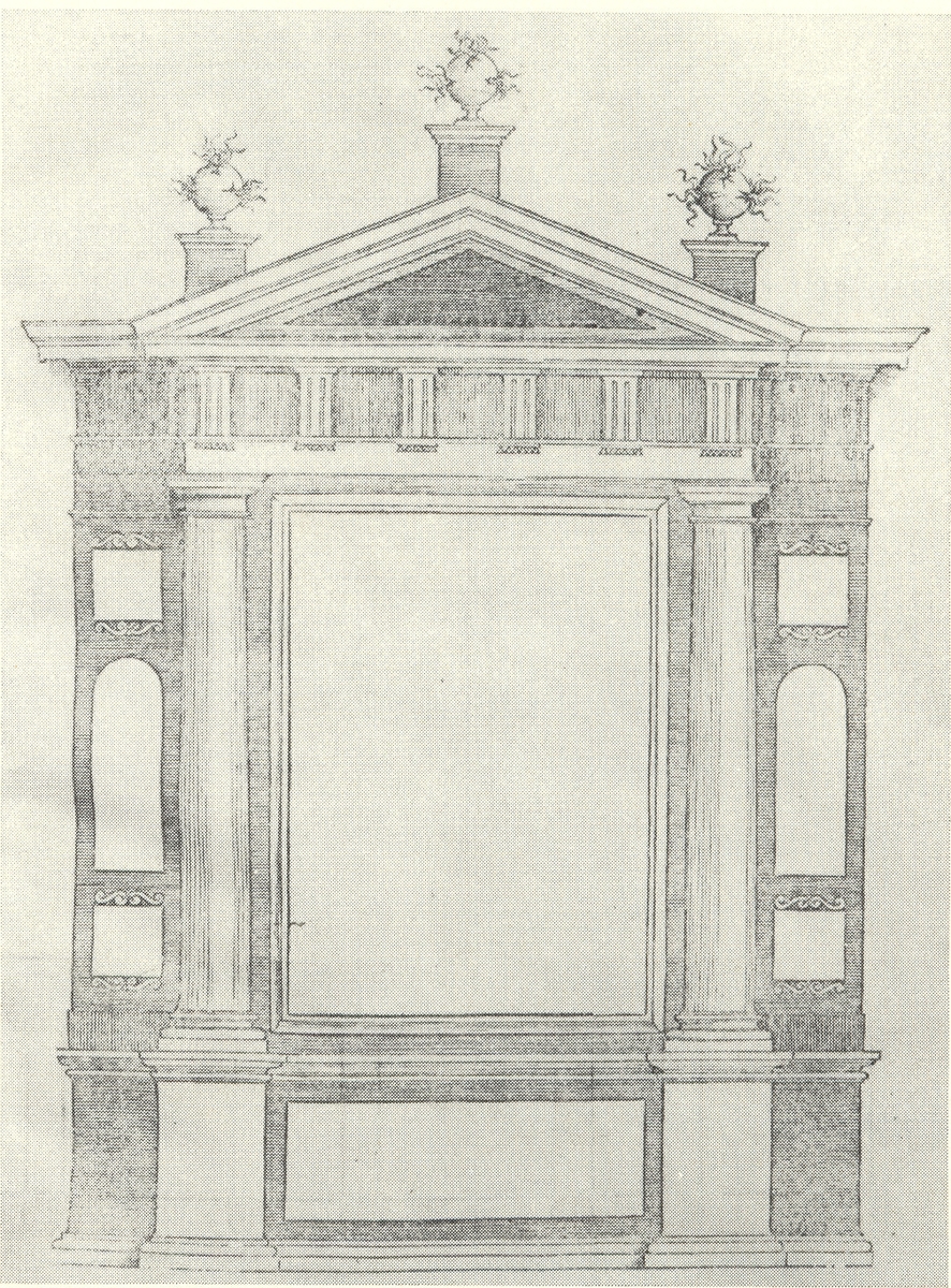 Kalmar slott. Ritning till kolonnuppställning med froton av Sebastiano Serlio; ur fjärde boken av hans verk, uppl. 1540.