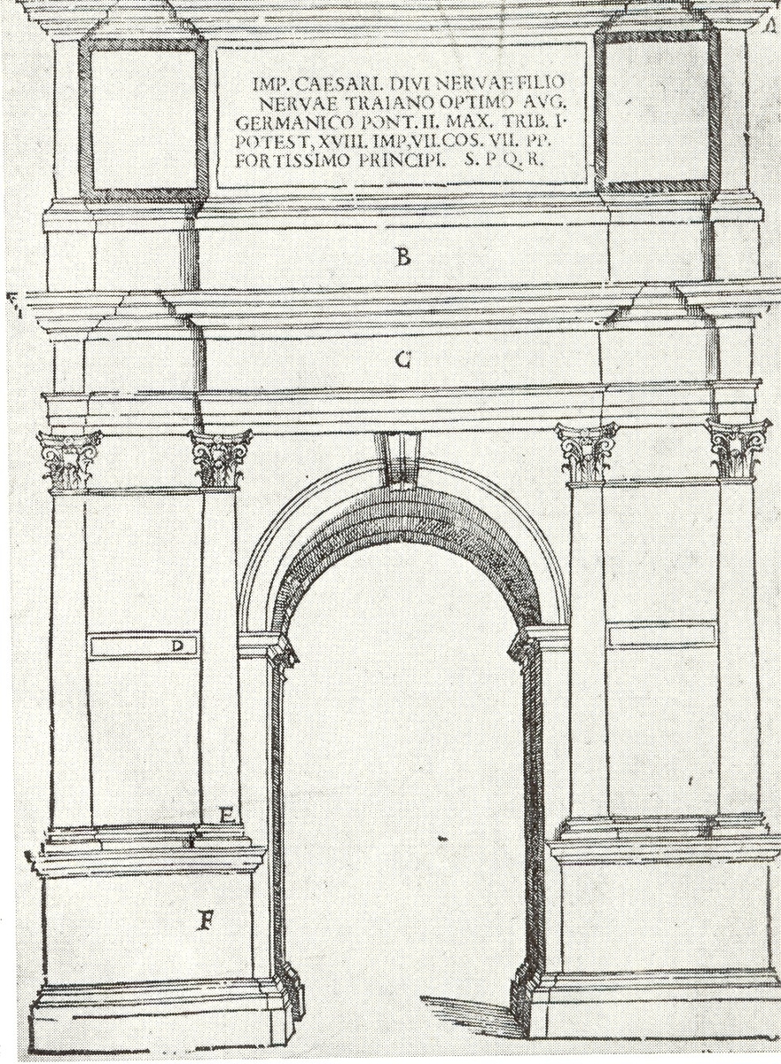 Kalmar slott. Den romerska triumfbågen i Benevento, uppförd 114-116 efter kristus. Enligt uppmätning i tredje boken av Sebastiano Serlios verk, tyska upplagan av år 1608.