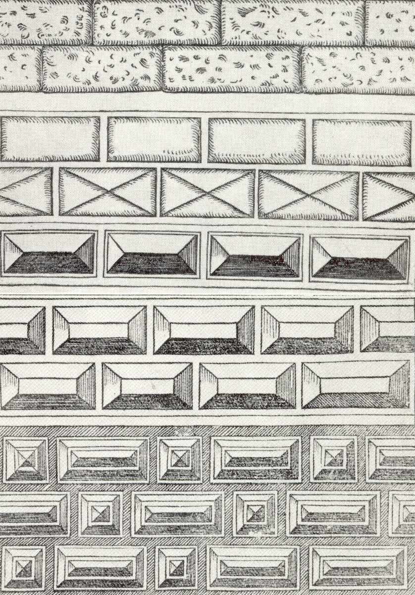 Kalmar slott. Olika slag rustikmurverk. Ur Vitruvius Tetsch (Nûrnberg 1548), där kopierad efter motsvarade bild i Serlios fjärde bok.