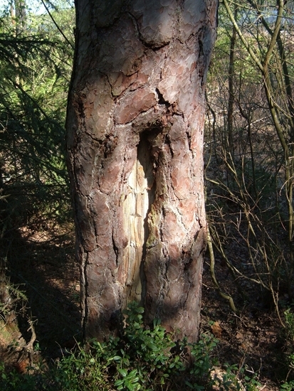 Foto av tjärtall. Spår efter sk tjäruväckeri, där levande tallar skattades på tjärved.