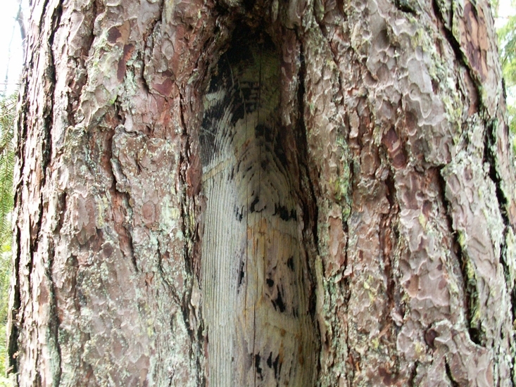Foto av tjärtall, närbild. Spår efter sk tjäruväckeri, där levande tallar skattades på tjärved. Tydliga huggmärken.