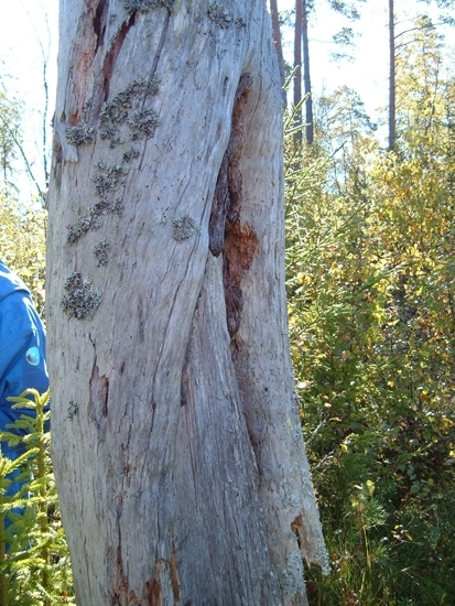 Foto av tjärtall. Tallen död sedan länge. Spår efter sk tjäruväckeri, där levande tallar skattades på tjärved.