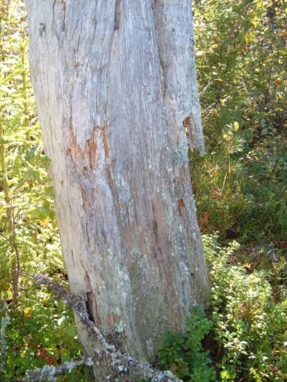 Foto av tjärtall. Tallen död sedan länge. Spår efter sk tjäruväckeri, där levande tallar skattades på tjärved.