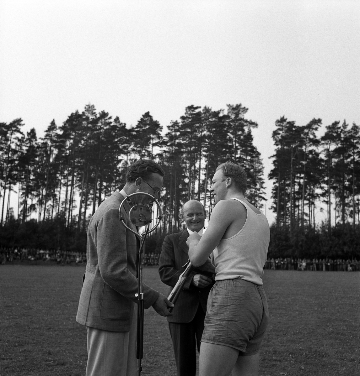 Idrottens dag på Värendsvallen. Prisutdelning. En man i löparkläder får pris (ett gevär ?).