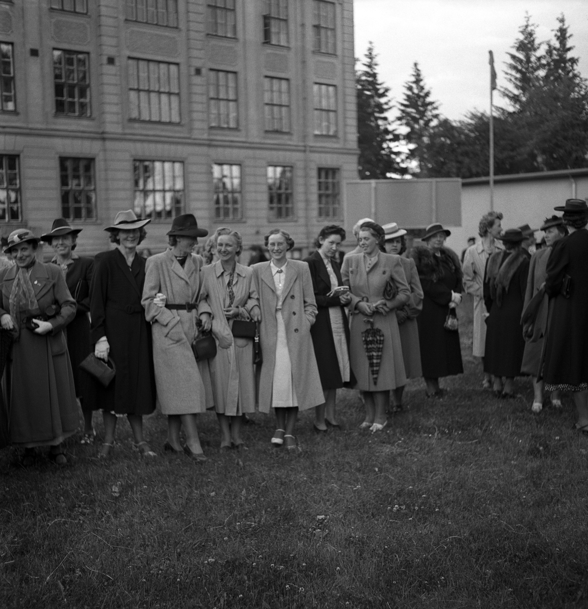 Ett antal uppklädda damer har samlats vid Flickskolan
