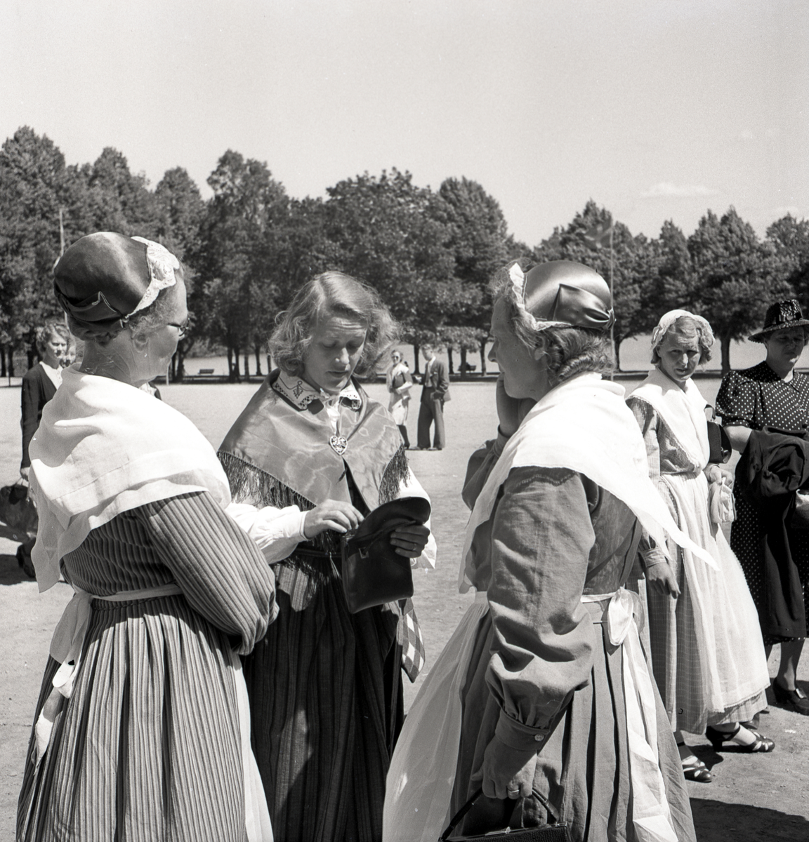 Några kvinnor i husmorsdräkter (och folkdräkt), pratar på skolgården framför Växjö Högre Allmänna Läroverk.
