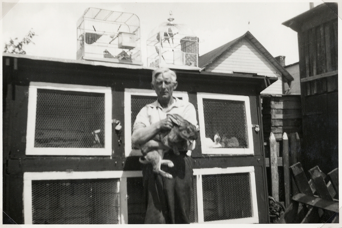 En medelålders man står framför några kaninburar, med en kanin i famnen.