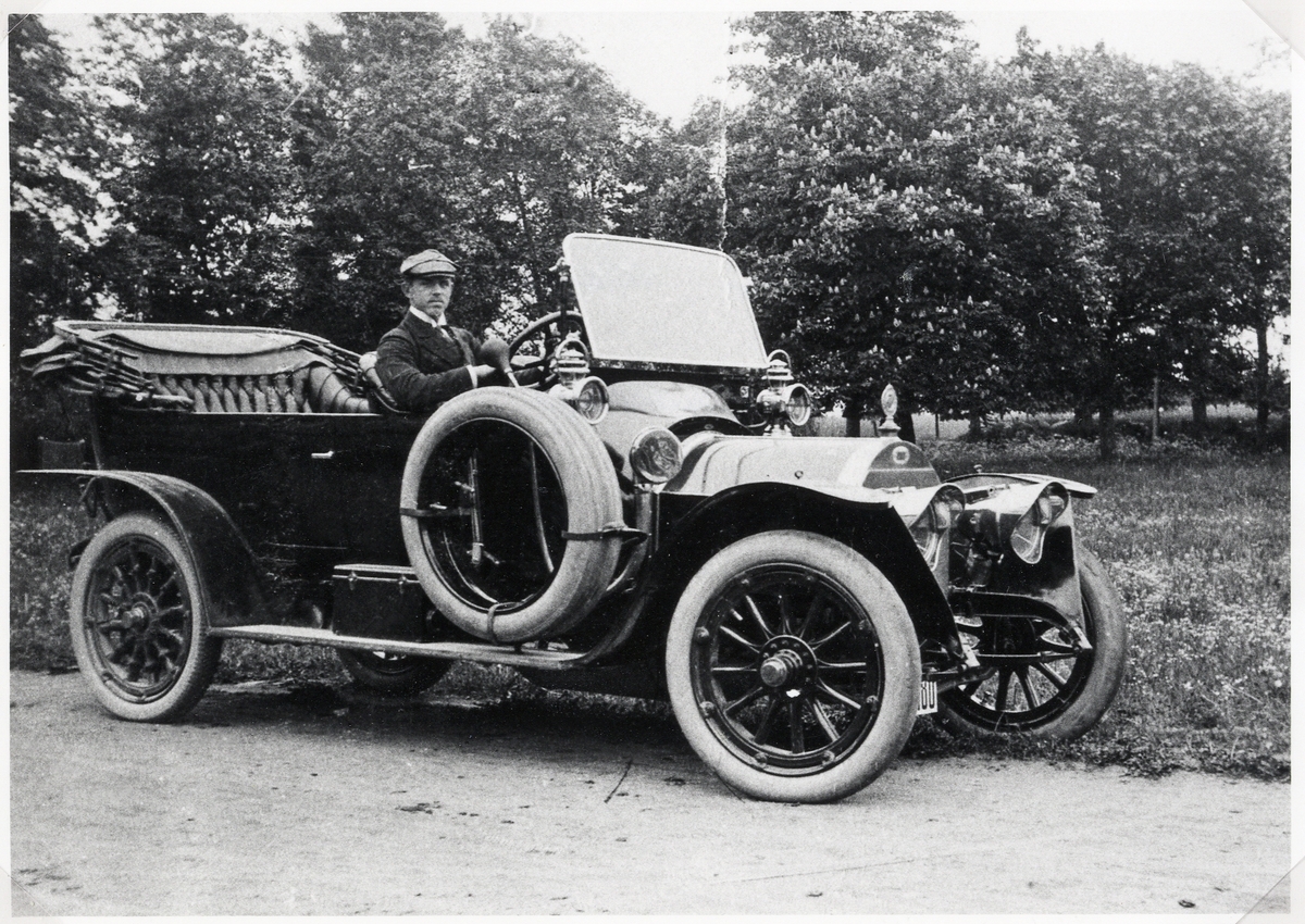 En man i kavaj och keps poserar i sin bil, parkerad på en grusväg vid Kronobergs kungsgård, ca 1920.