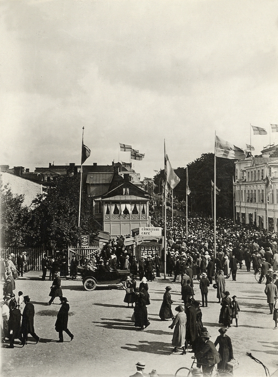 Gustaf V på besök i Växjö, 1920-tal. Bilen med kungen passerar på Norra Järnvägsgatan i korsningen mot
