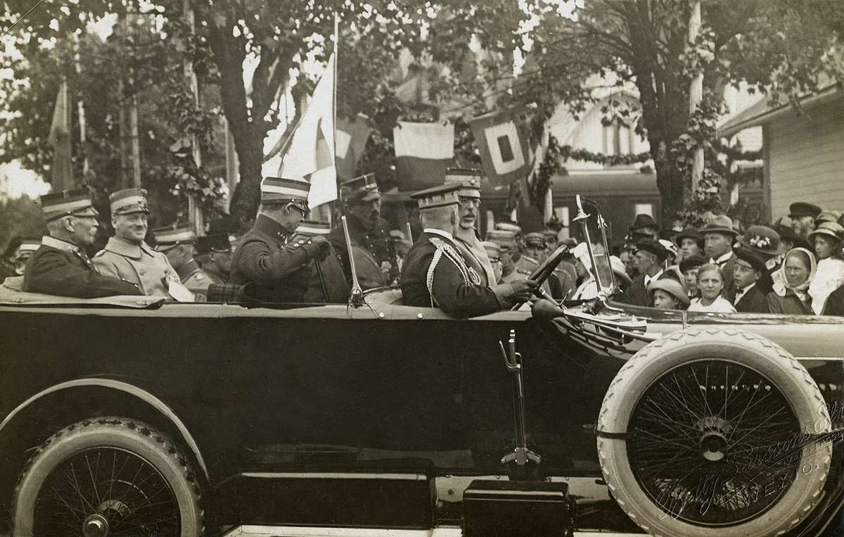 Gustaf V i bil, på besök i Växjö 1917, i samband med en militärmanöver. Fotot är trol. taget på stationsplanen framför järnvägsstationen.