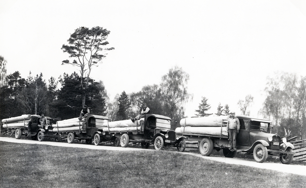 Timmertransport, Linneryd 1930. Lastbilarna är alla av märket Ford.
