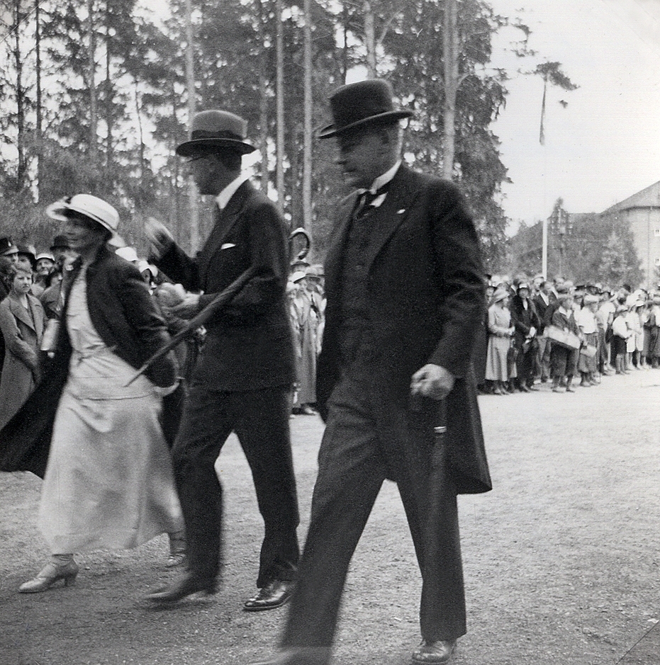 Dåv. kronprins Gustaf Adolf tillsammans med landshövdingeparet August och Ingegerd Beskow, trol. vid invigningen av Värendsvallen 1937.