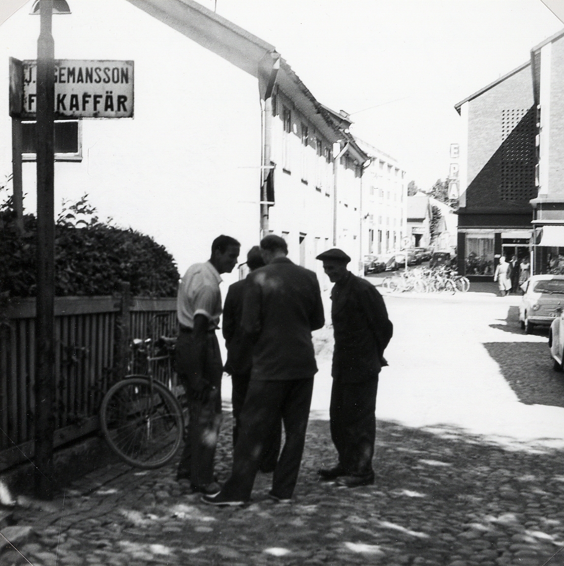 Män i samtal på Båtsmansbacken, Bäckgatan, Växjö. 1959.