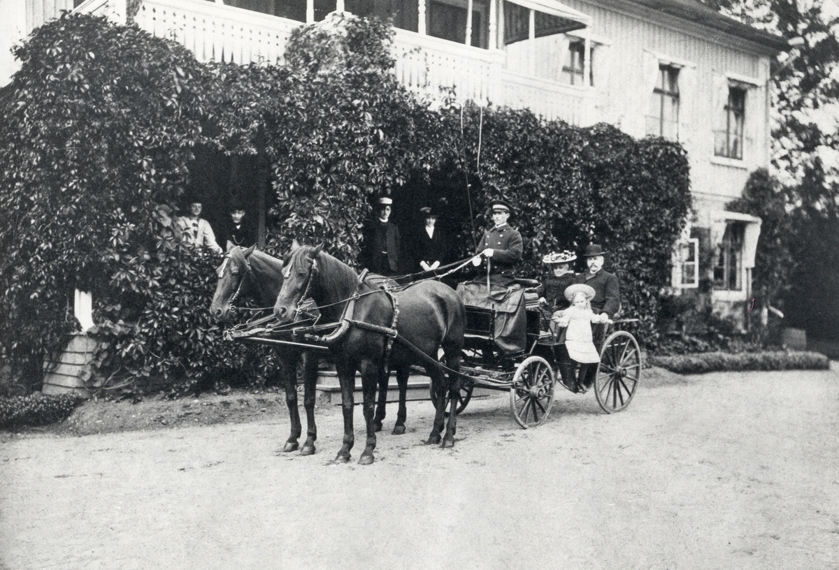 Häradshövding Montelius med fru och yngsta dotter ska ut och åka. Flera ur den övriga familjen övervakar det hela