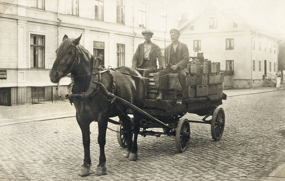 Bryggeritransport. Kusken Ståhle med hjälpreda kör ut öl från Bayerska bryggeriet, Växjö, ca 1920.