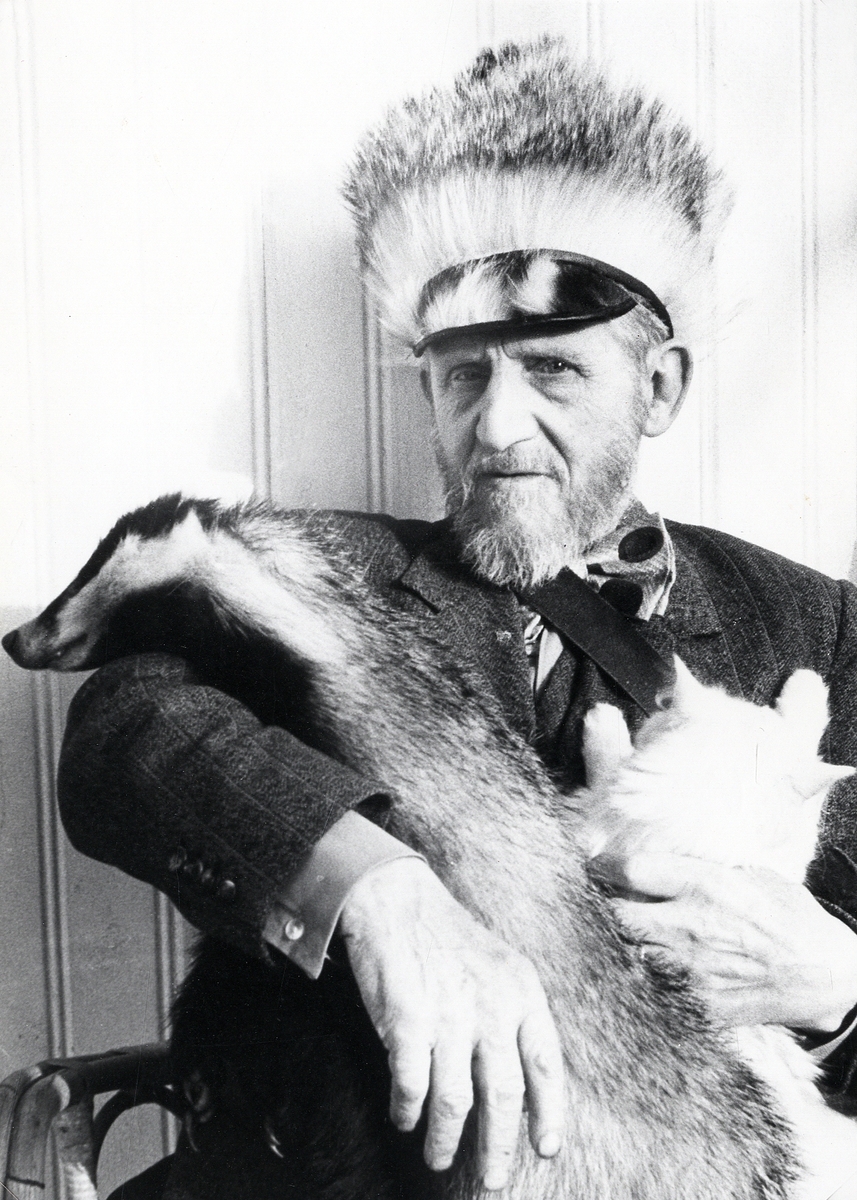 Iförd grävlingsmössa med katt och en (uppstoppad) grävling i famnen.
