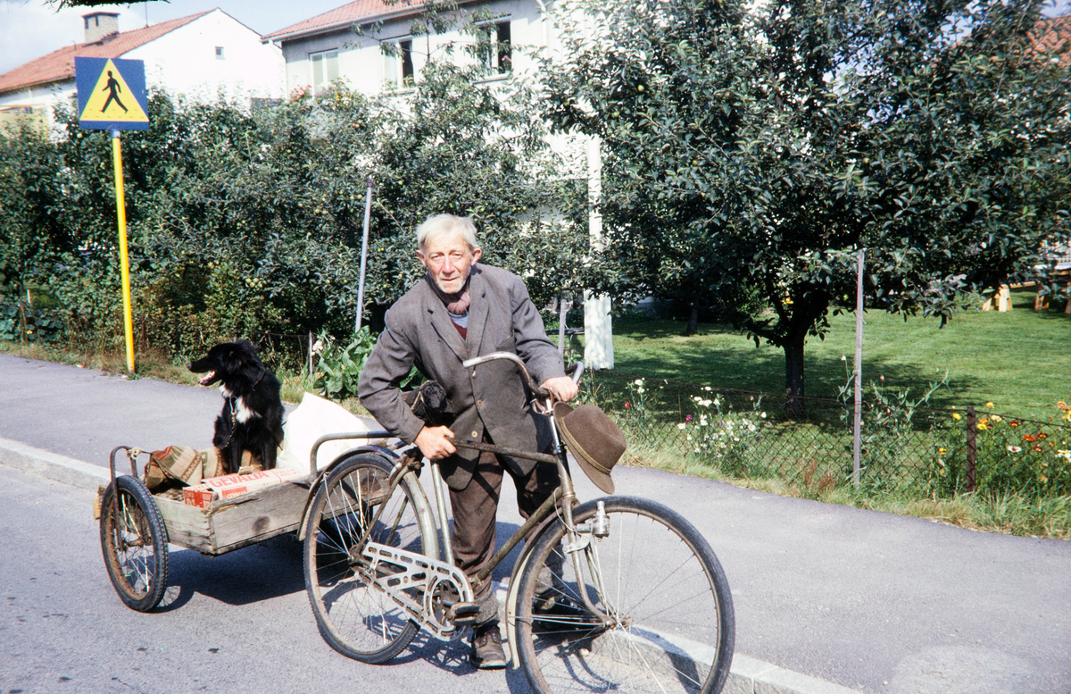 Växjöbo (P. Nilsson på Höjden?) med cykel och hund på cykelkärra, Fagrabäcksvägen, mitten av 1960-talet.