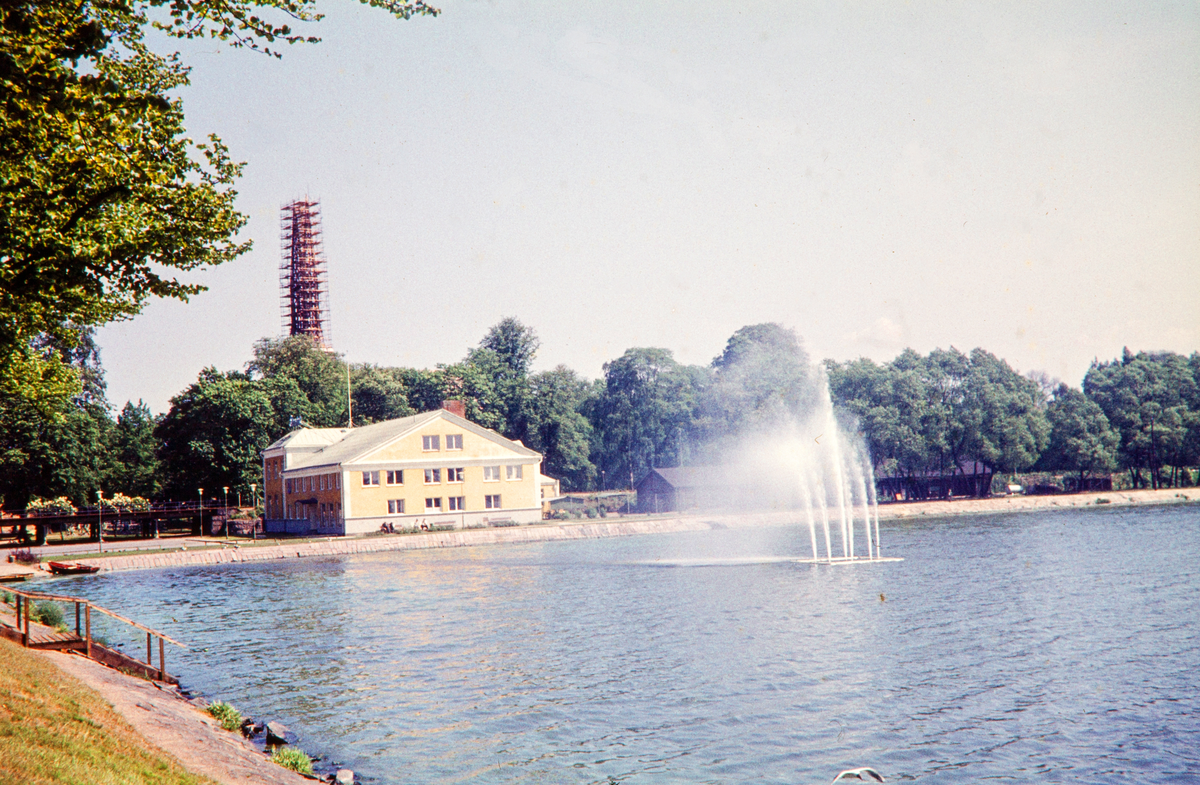 Elverket vid Växjösjön. I bakgrunden syns byggnadsställningar runt de nya tornspirorna på Växjö domkyrka.