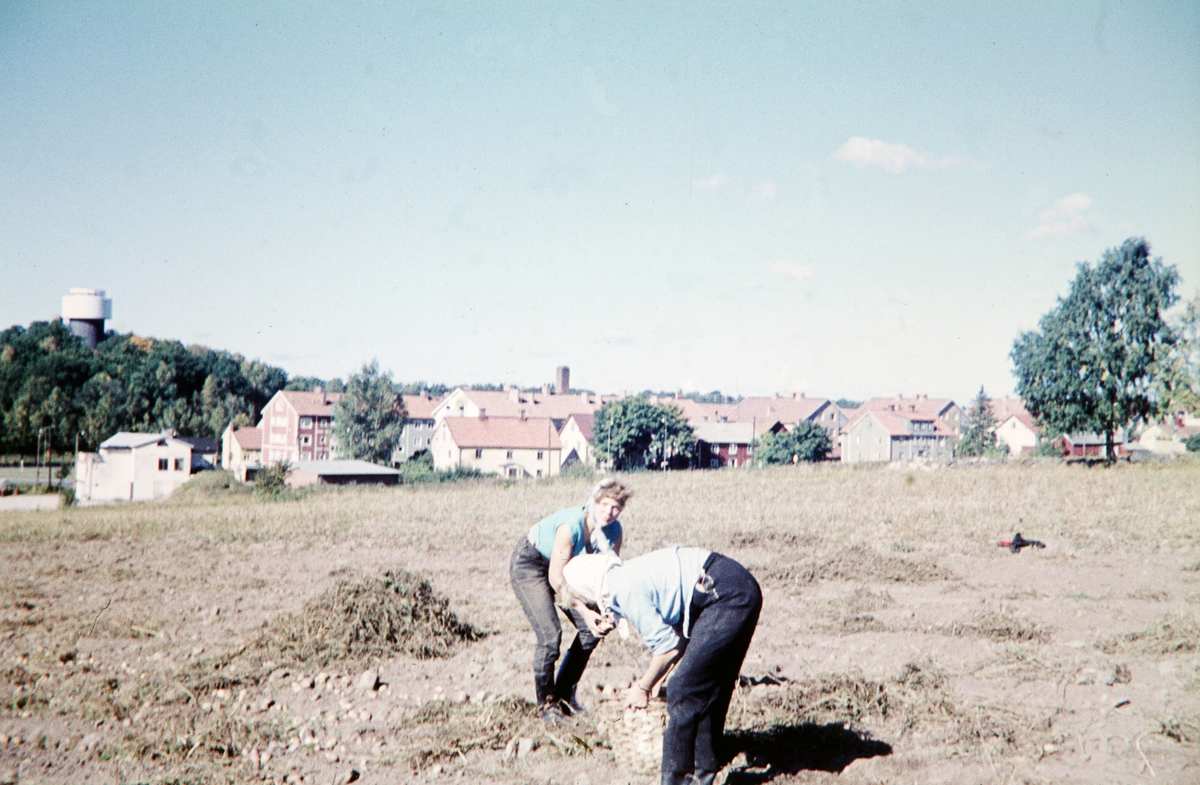 Potatisupptagning på Norr, Växjö. I bakgrunden skymtar det nya vattentornet och bebyggelsen längs Gamla Norrvägen m.m..