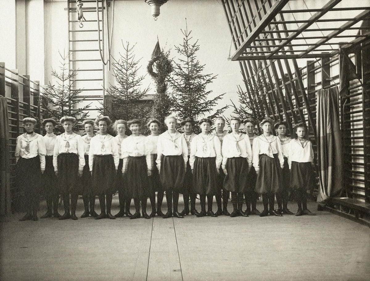 En grupp kvinnliga gymnaster i gymnastiksalen på småskoleseminariet (Ringsbergsskolan) (?). I bakgrunden är