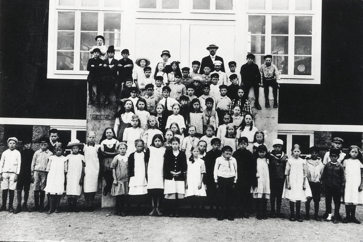 Skolelever har samlats på trappan till ingången. Lärare: David Lindahl (?) och (?).