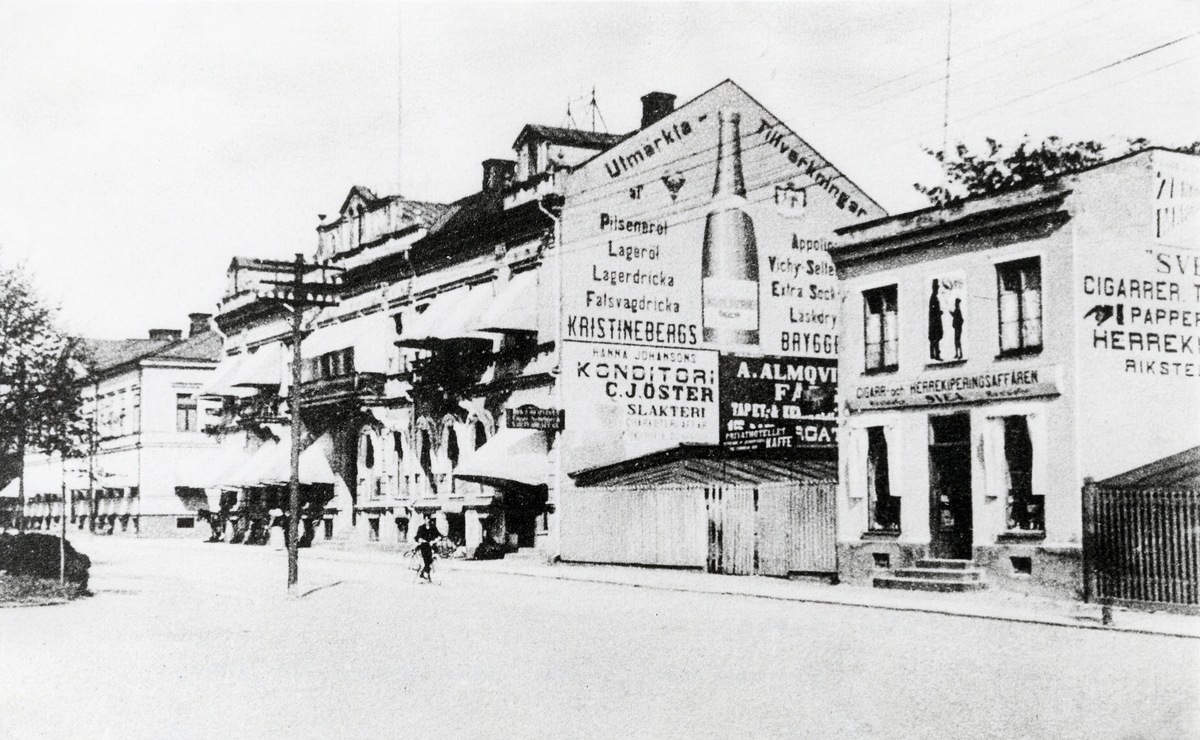 Norra Järnvägsgatan, Växjö, ca. 1905. Husfasad full med reklam.