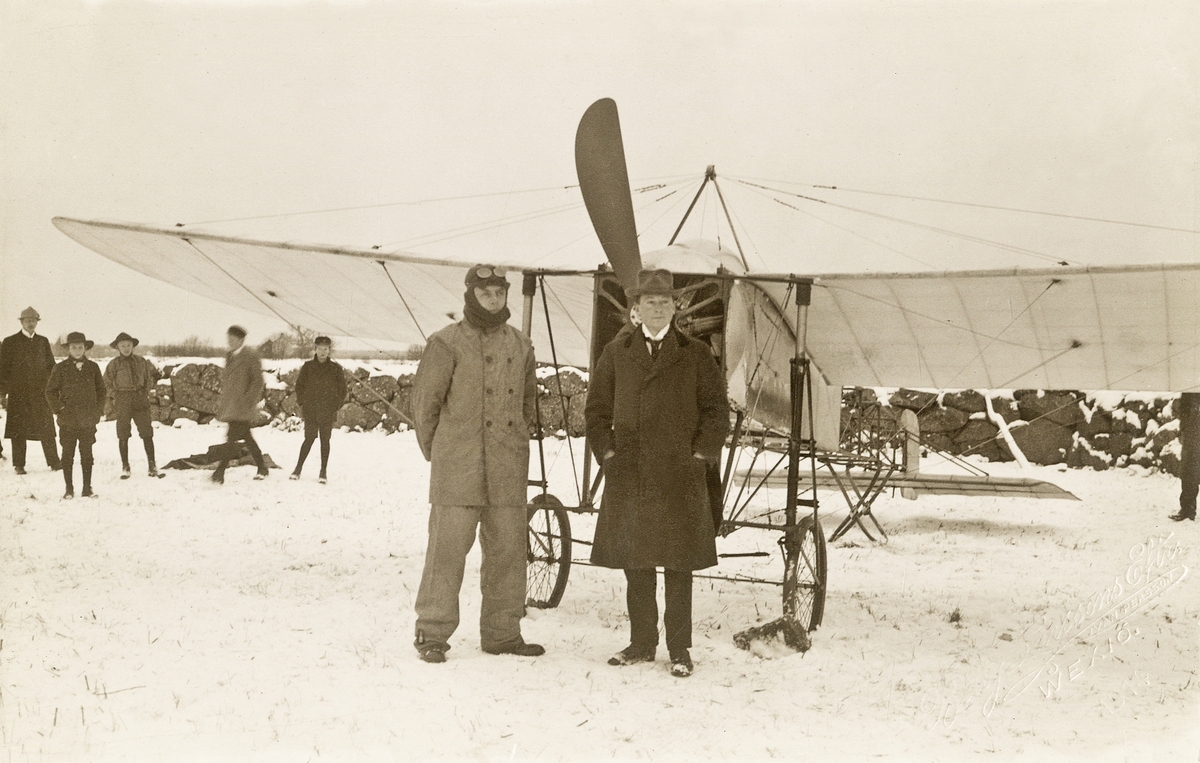 Enoch Thulin t.v., med en annan man vid flyguppvisning i Växjö, 1914. I bakgrunden syns några nyfikna.