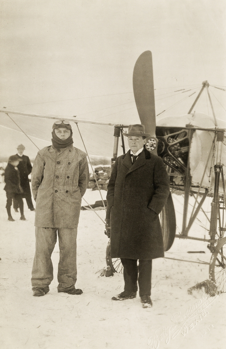 Enoch Thulin t.v., med en annan man vid flyguppvisning i Växjö, 1914. I bakgrunden syns några nyfikna.