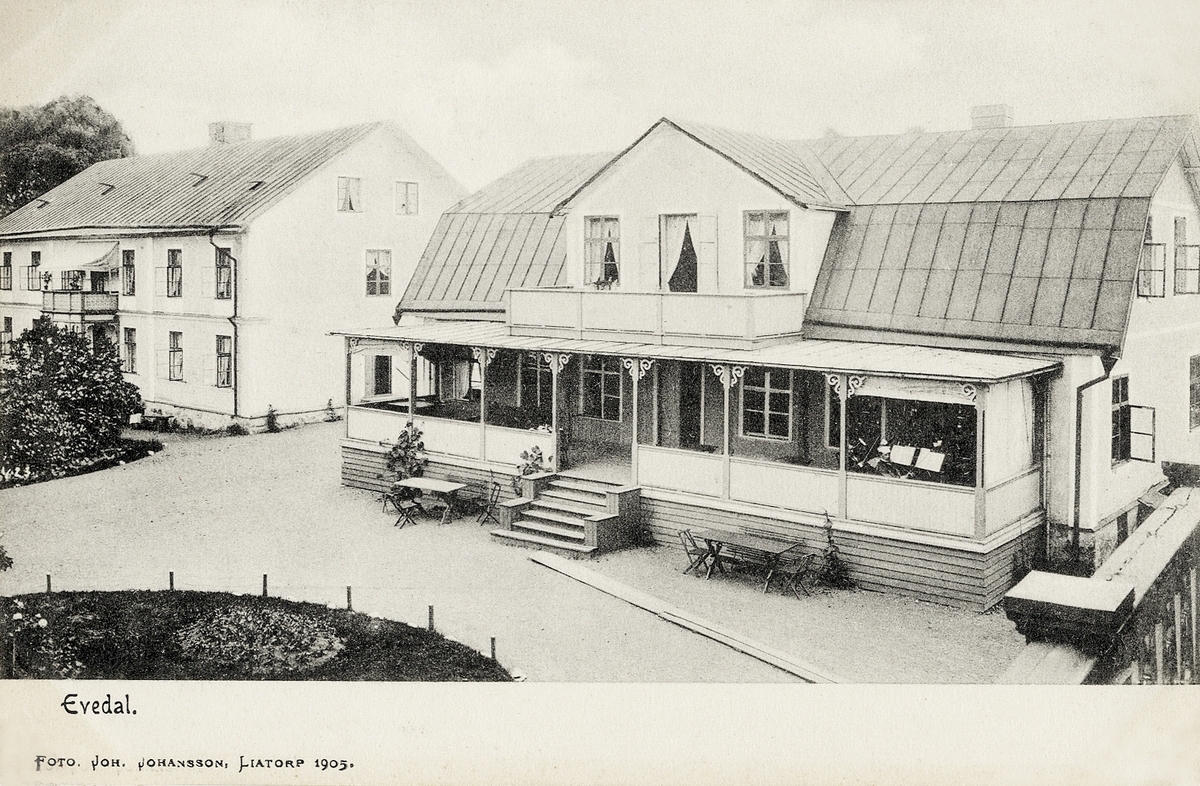 Evedals hälsobrunn med restaurang. Foto från balkongen på Societetetshuset åt parksidan, 1905.