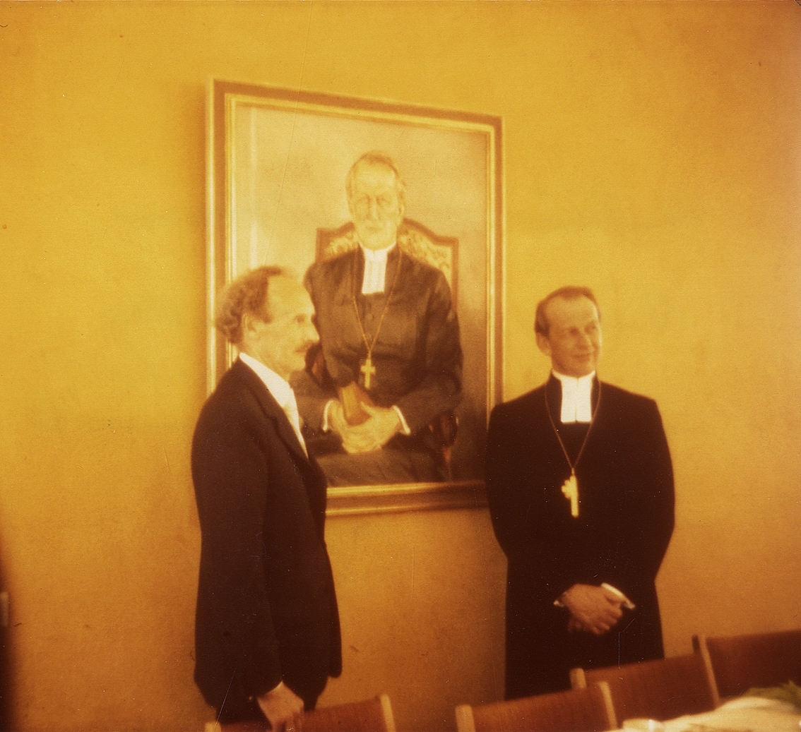 Konstnären Sven Joann och biskop Olof Sundby (senare ärkebiskop), vid avtäckandet av den senares porträtt,