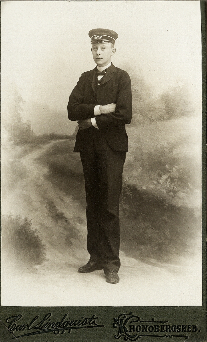 En ung man i mörk kostym med väst, skolmössa m.m.