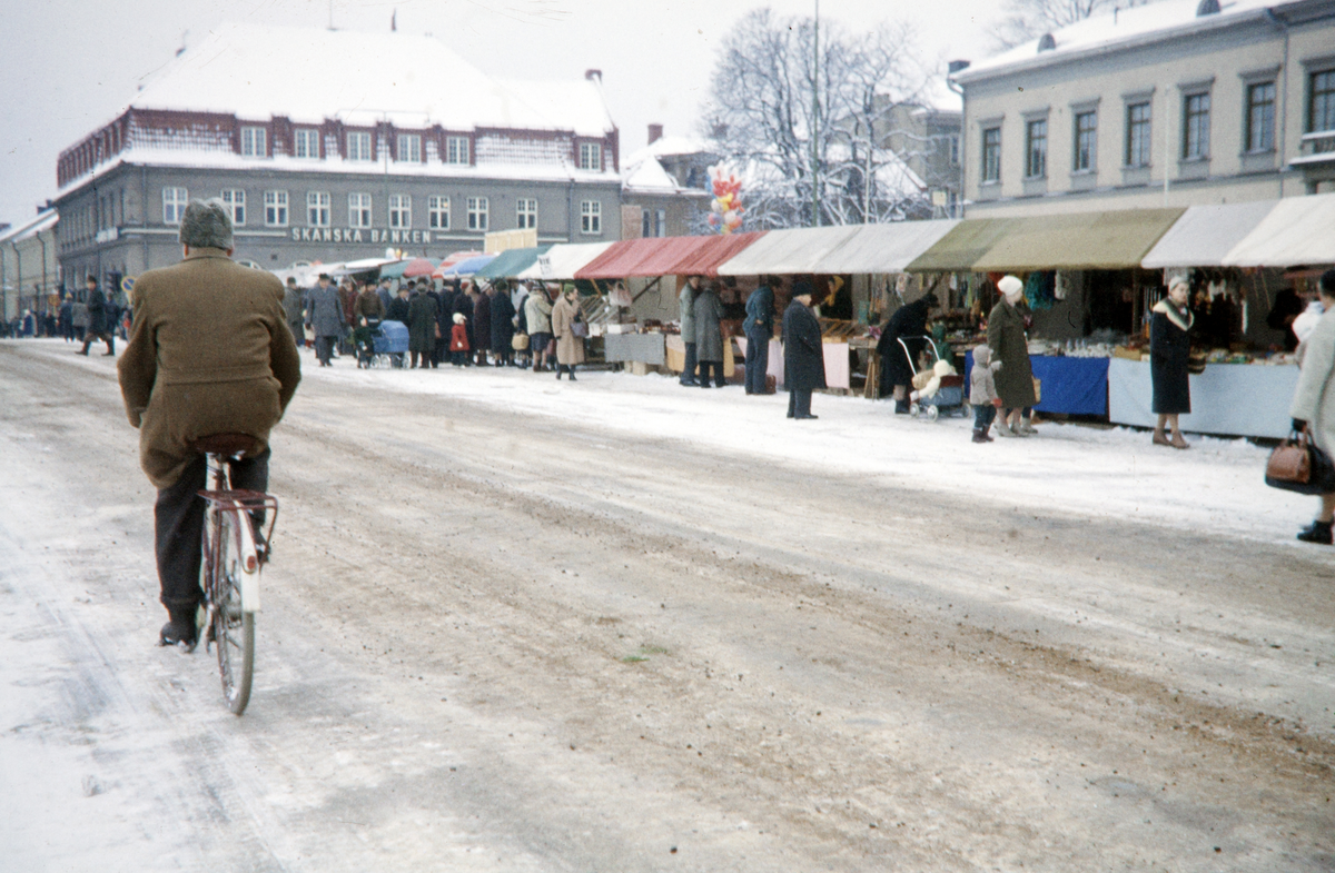 Marknad på Stortorget, Växjö. Sigfridsmäss (?). Till höger syns residenset och mitt fram några av byggnaderna längs Kungsgatan.