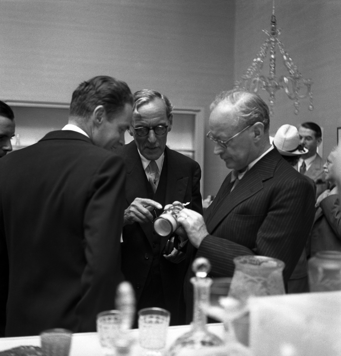 Glasets dag. Smålands Museum. Jan Erik Anderbjörk, dåv. landsantikvarie, och några äldre herrar, diskuterar ett föremål i glasutställningen.