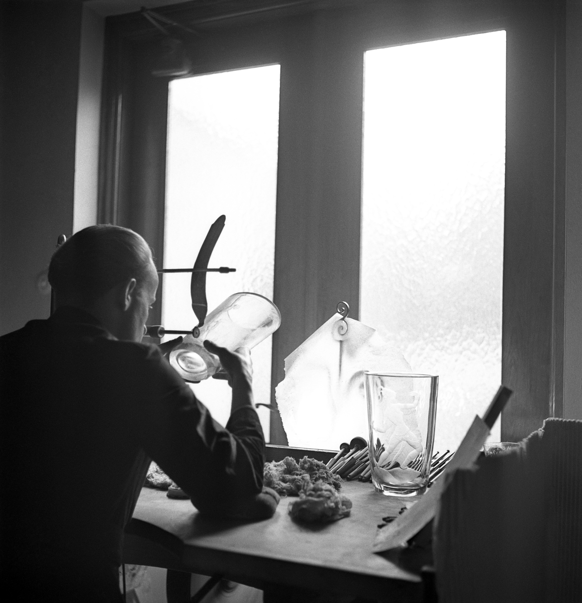 Glasets dag. Smålands Museum. Gravöerverkstaden. En man sitter och graverar glasvaser i motljus.